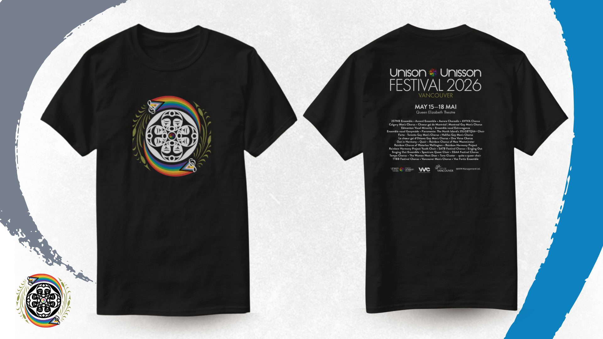 These black, 100% cotton shirts feature the festival logo on the front and event details on the back, including the names of all participating choruses and ensembles. The design shown may change slightly before production, but the shirt colour will remain black. Size swaps may be available on-site, depending on remaining inventory.